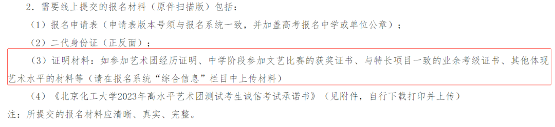 证明材料:如参加艺术团经历证明、中学阶段参加文艺比赛的获奖证书、与特长项目一致的业余考级证书、其他体现艺术水平的材料等(请在报名系统“综合信息”栏目中上传材料)